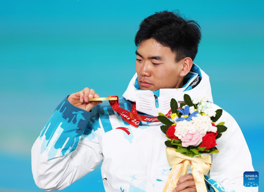 Gold medalist Liu Zixu of China looks at his medal during the awarding ceremony of Para Biathlon Men's Sprint Sitting of Beijing 2022 Paralympic Winter Games at Zhangjiakou Medals Plaza in Zhangjiakou, north China's Hebei Province, March 6, 2022. (Xinhua/Jia Haocheng)