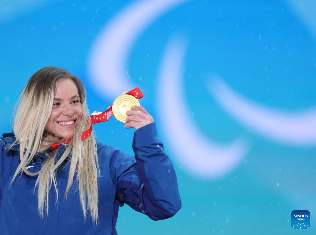 Gold medalist Oksana Masters of the United States poses for a photo during the awarding ceremony of Para Biathlon Women's Sprint Sitting of Beijing 2022 Paralympic Winter Games at Zhangjiakou Medals Plaza in Zhangjiakou, north China's Hebei Province, March 6, 2022. (Xinhua/Jia Haocheng)