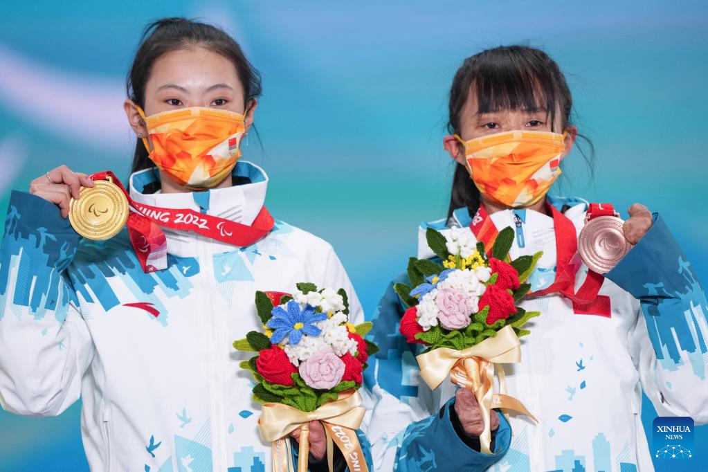 Bronze medalist Zhu Daqing(R) of China and her guide Yan Hanhan pose for a photo during the awarding ceremony for the Alpine Skiing Women's Super-G Vision Impaired of Beijing 2022 Paralympic Winter Games at Yanqing Medals Plaza of the Winter Paralympics in Yanqing District, Beijing, capital of China, March 6, 2022. (Xinhua/Li Jianan)