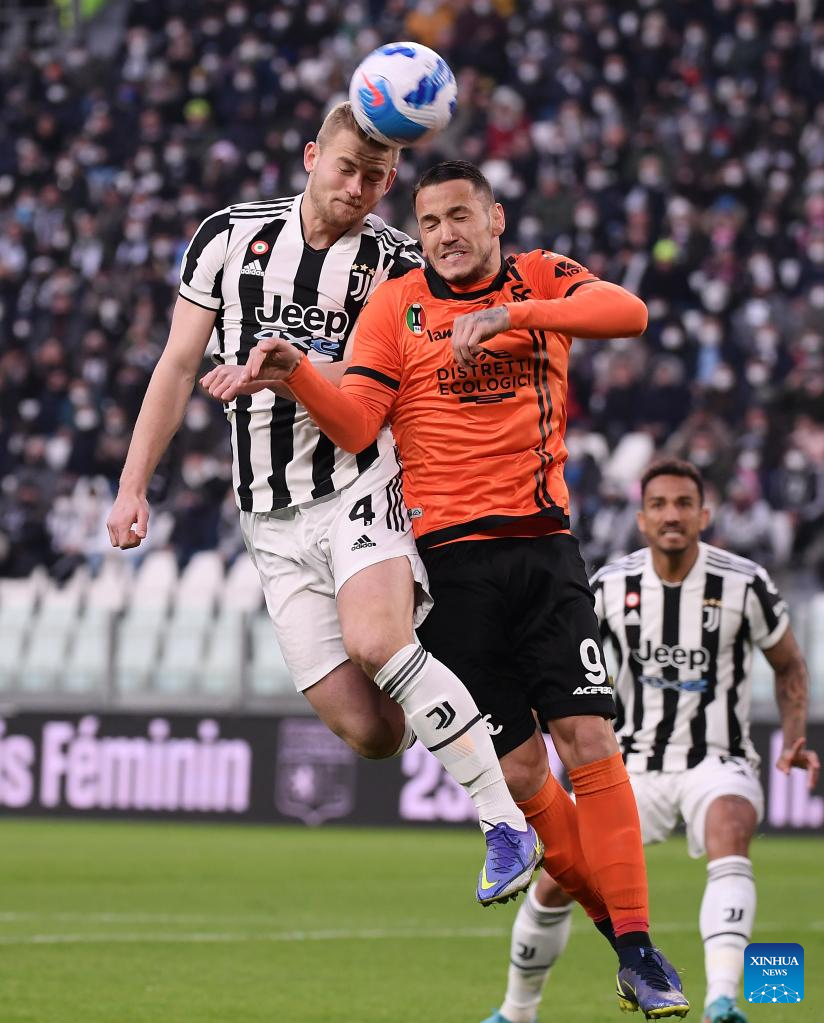 FC Juventus' Matthijs De Ligt (L) vies with Spezia's Rey Manaj during a Serie A football match between FC Juventus and Spezia in Turin, Italy, on March 6, 2022. (Photo by Federico Tardito/Xinhua)