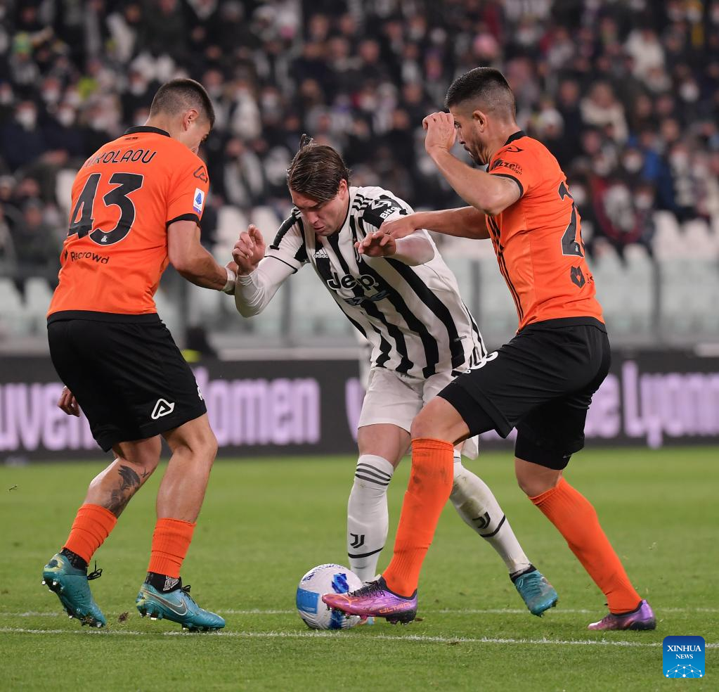 FC Juventus' Dusan Vlahovic (C) vies with Spezia's Dimitrios Nikolaou (L) and Martin Erlic during a Serie A football match between FC Juventus and Spezia in Turin, Italy, on March 6, 2022. (Photo by Federico Tardito/Xinhua)