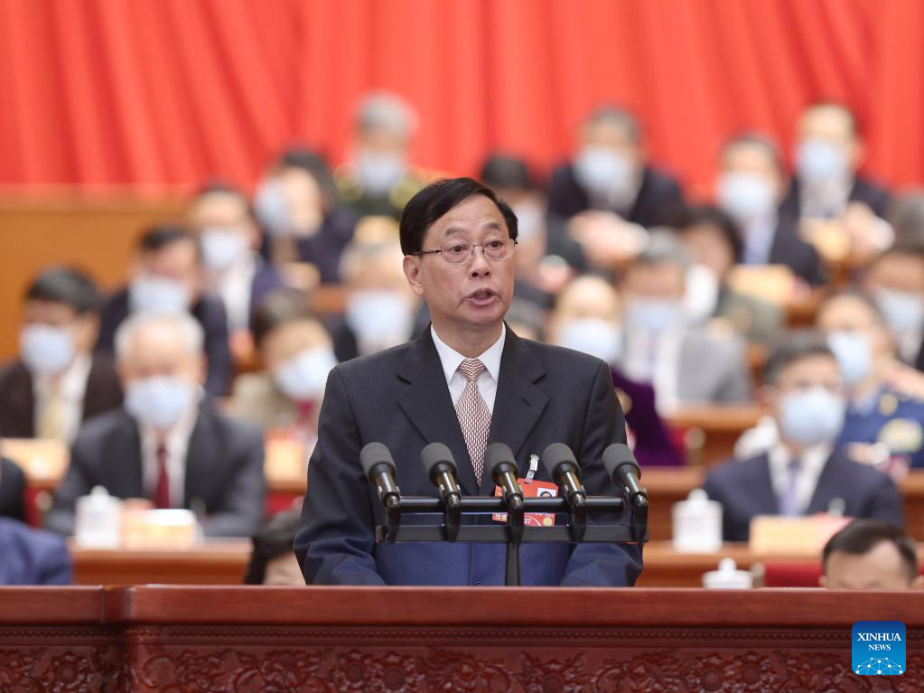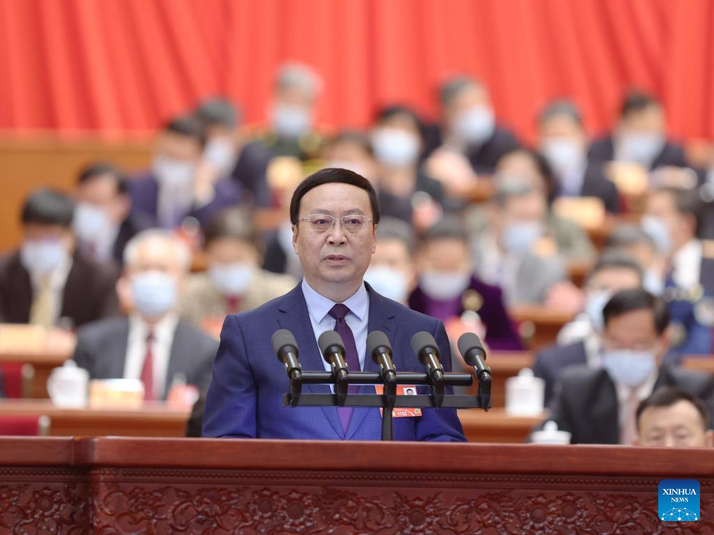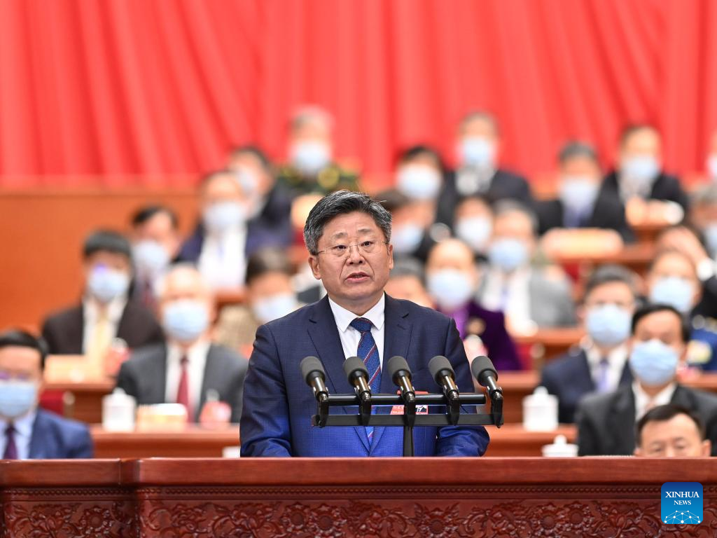 Wang Hong, a member of the 13th National Committee of the Chinese People's Political Consultative Conference (CPPCC), delivers a speech on behalf of the Central Committee of the Revolutionary Committee of the Chinese Kuomintang at the second plenary meeting of the fifth session of the 13th CPPCC National Committee at the Great Hall of the People in Beijing, capital of China, March 7, 2022. (Xinhua/Ding Lin)