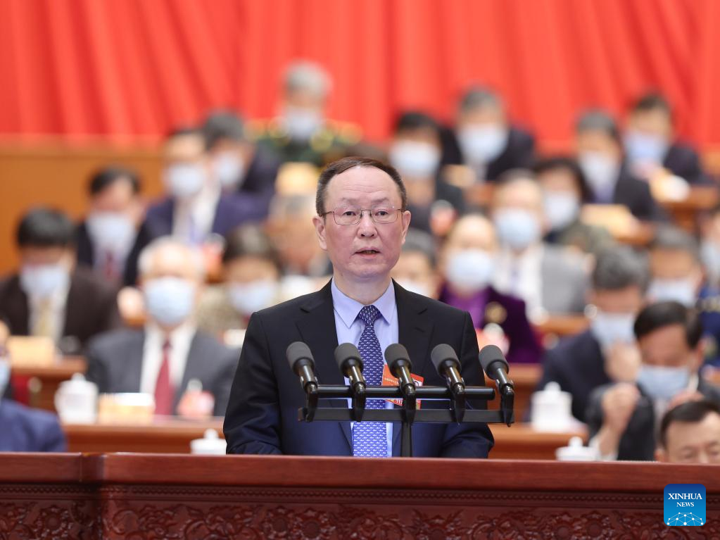 Huang Zhen, a member of the 13th National Committee of the Chinese People's Political Consultative Conference (CPPCC), delivers a speech on behalf of the Central Committee of the China Association for Promoting Democracy at the second plenary meeting of the fifth session of the 13th CPPCC National Committee at the Great Hall of the People in Beijing, capital of China, March 7, 2022. (Xinhua/Li Xiang)