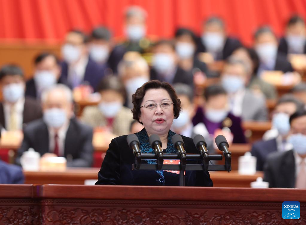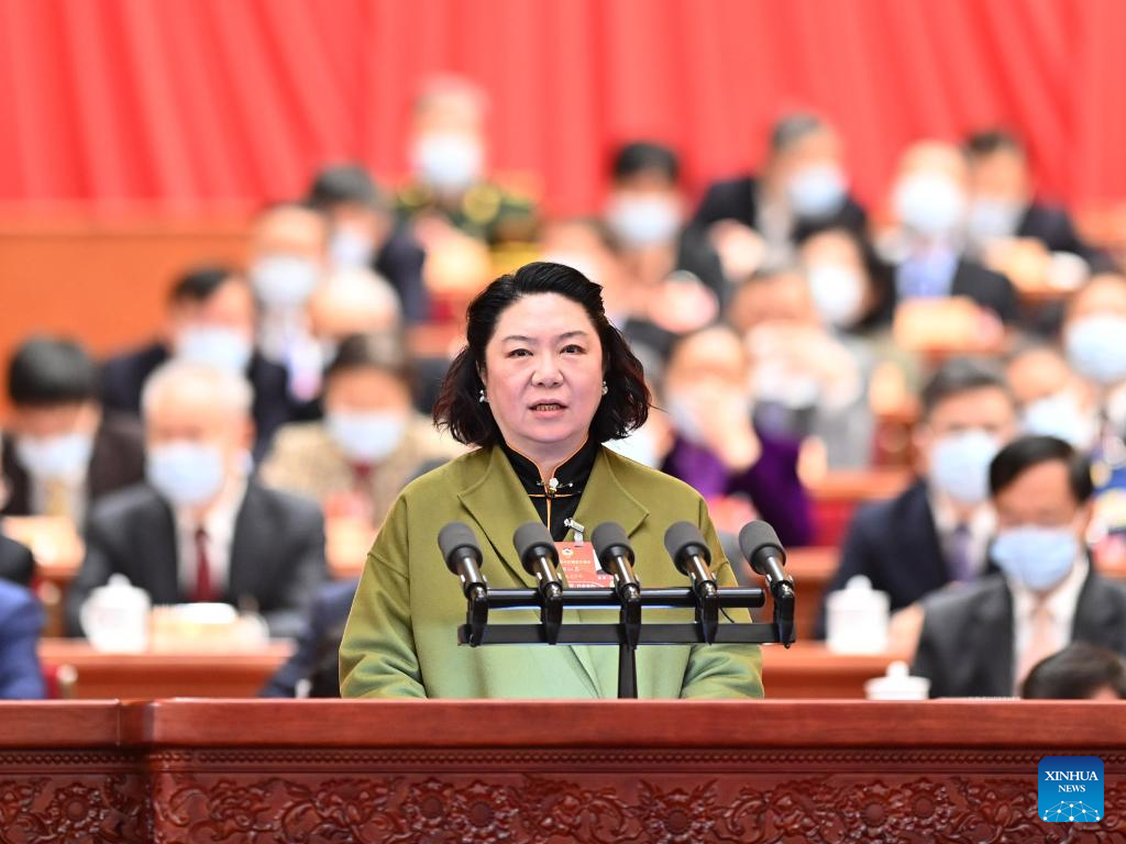 Tian Qinxin, a member of the 13th National Committee of the Chinese People's Political Consultative Conference (CPPCC), delivers a speech at the second plenary meeting of the fifth session of the 13th CPPCC National Committee at the Great Hall of the People in Beijing, capital of China, March 7, 2022. (Xinhua/Li Xiang)