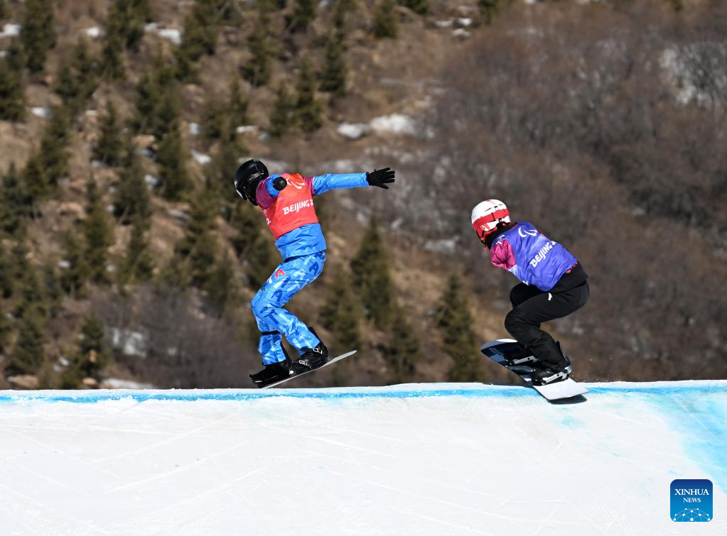 Ji Lijia (R) and Wang Pengyao of China compete during the Para Snowboard Men's Cross UL event of Beijing 2022 WinterParalympic Games at Genting Snow Park in Zhangjiakou, north China's Hebei Province, March 7, 2022. (Xinhua/Xue Yuge)
