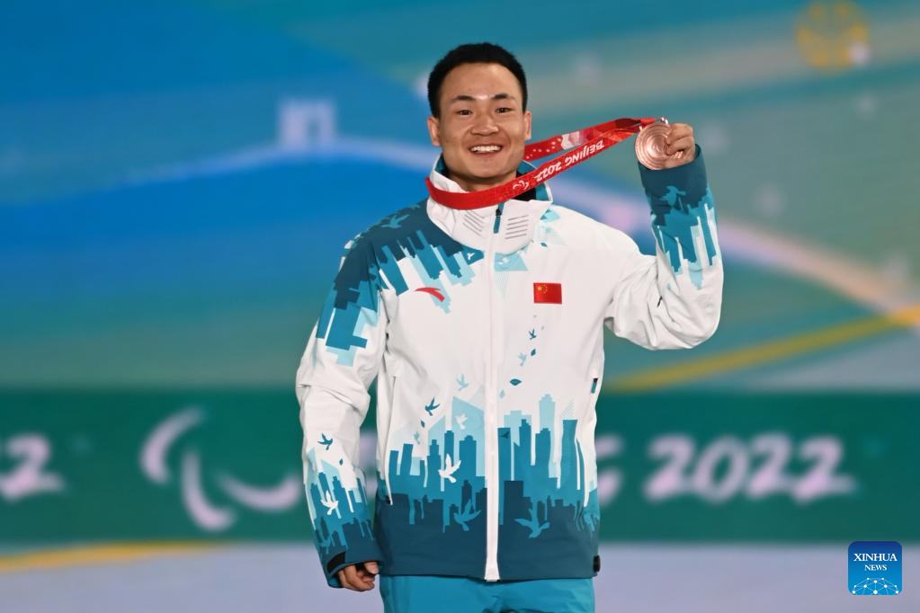 Bronze medalist Wu Zhongwei of China poses for photos during the awarding ceremony for Para Snowboard Men's Snowboard Cross SB-LL1 event of Beijing 2022 Paralympic Winter Games at Zhangjiakou Medals Plaza in Zhangjiakou, north China's Hebei Province, March 7, 2022. (Xinhua/Xue Yuge)