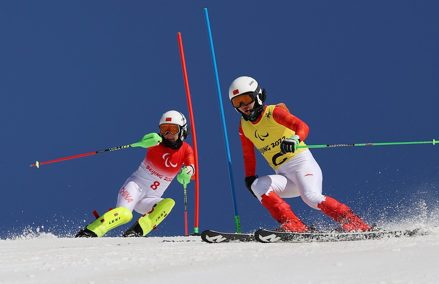 China's Zhu Daqing (L) and her guide Yan Hanhan compete in the Para Alpine skiing women's super combined vision impaired of Beijing 2022 Winter Paraympic Games in Yanqing District, Beijing, March 7, 2022. (Xinhua/Luo Yuan)