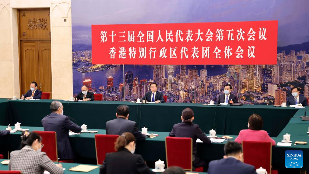 Chinese Vice Premier Han Zheng, also a member of the Standing Committee of the Political Bureau of the Communist Party of China Central Committee, attends a deliberation of Hong Kong delegation at the fifth session of the 13th National People's Congress (NPC) in Beijing, capital of China, March 7, 2022. (Xinhua/Liu Weibing)