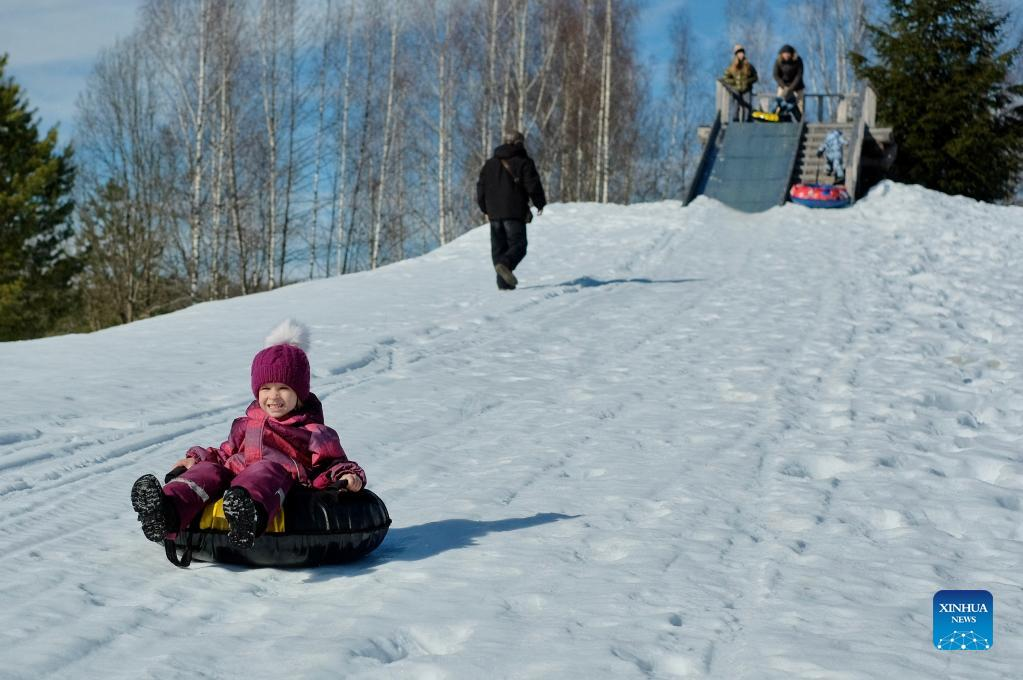 A child slides on a slope during Maslenitsa celebrations in Gamzyuki village, Kaluga region, Russia, on March 6, 2022. Maslenitsa is a traditional holiday to celebrate the beginning of spring. (Photo by Evgeny Andreev/Xinhua)