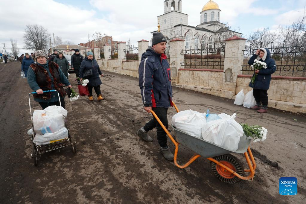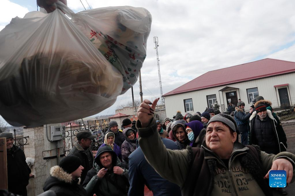 Local residents receive humanitarian aid in Donetsk on March 6, 2022. (Photo by Victor/Xinhua)