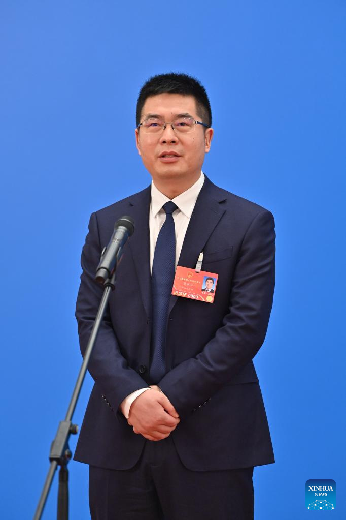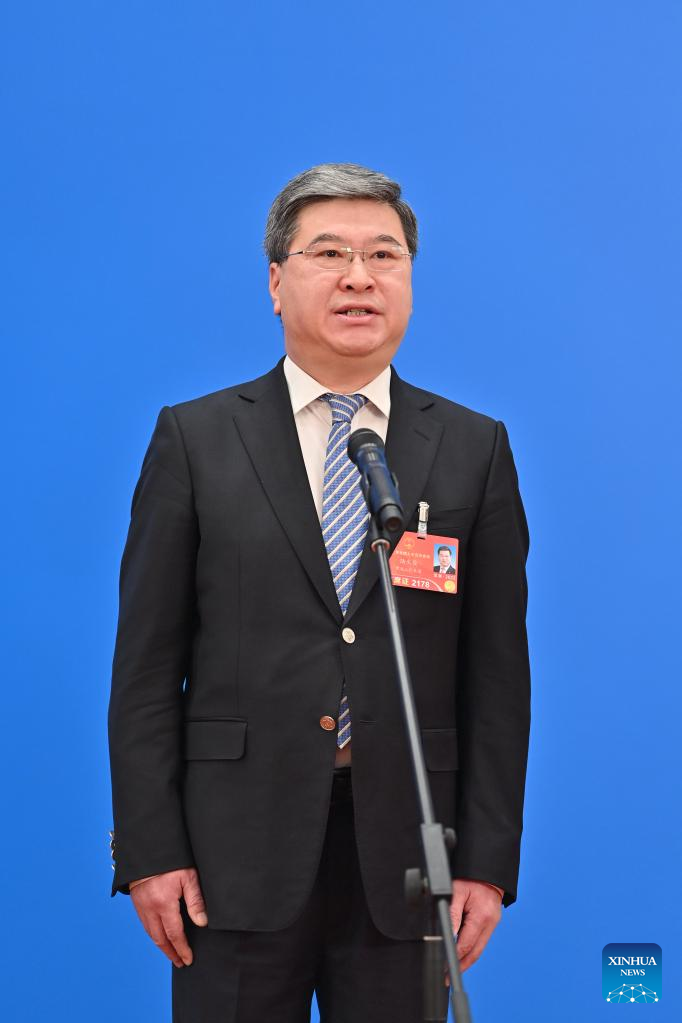 Li Hongliang, a deputy to the 13th National People's Congress (NPC), attends an interview via video link ahead of the second plenary meeting of the fifth session of the 13th NPC in Beijing, capital of China, March 8, 2022. (Xinhua/Li Xin)
