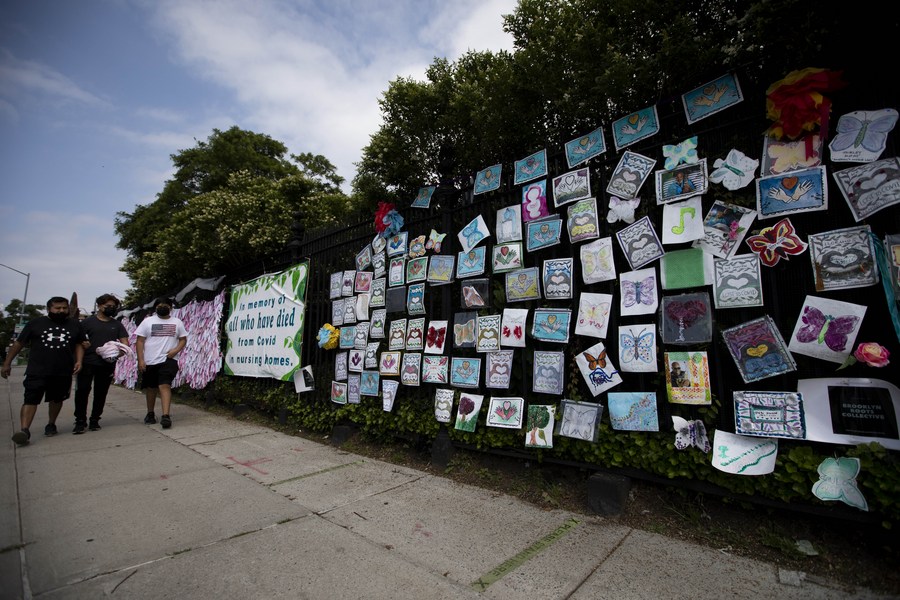 People walk past a memorial installation for those who died of COVID-19 outside Green-Wood Cemetery in New York, the United States, on June 14, 2021.(Xinhua/Wang Ying)