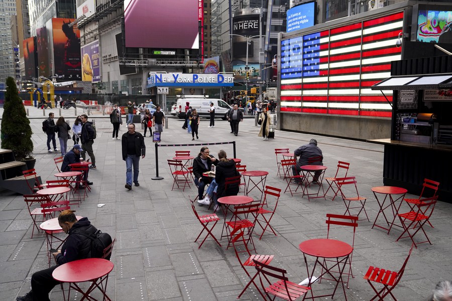 People are seen on Times Square in New York, the United States, March 7, 2022. (Xinhua/Wang Ying)