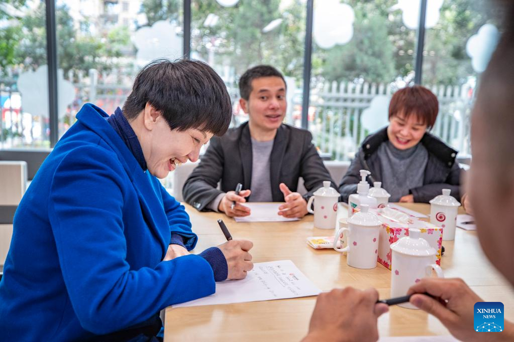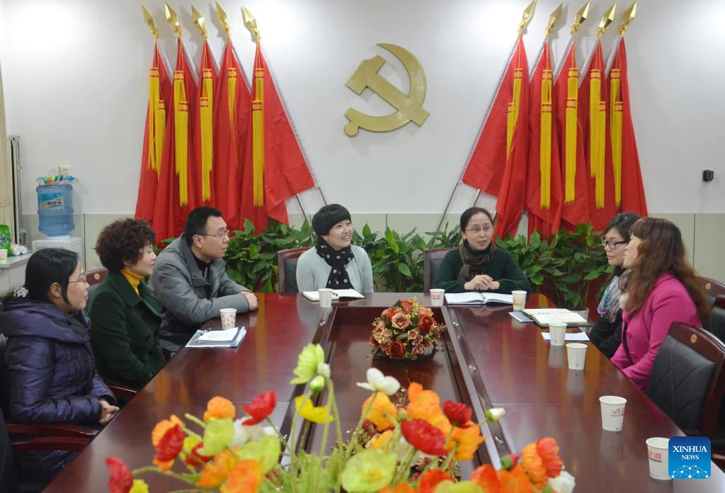 Liu Xiya (2nd R) seeks suggestions on the implementation of China's "double reduction" policy from representatives of school staff and education authorities at Xiejiawan Primary School in southwest China's Chongqing, Feb. 24, 2022.