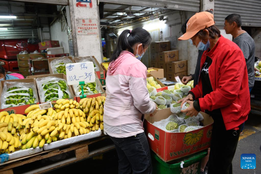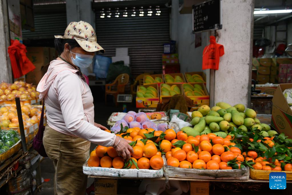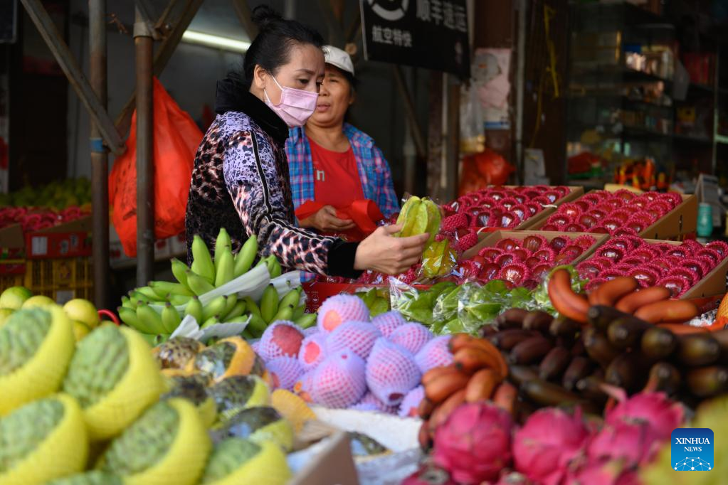 A customer selects fruits at a local market in Haikou, south China's Hainan Province, March 8, 2022. (Xinhua/Hu Zhixuan)