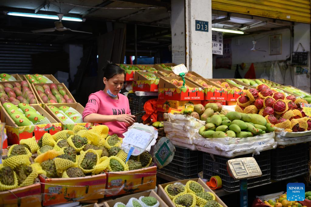 A vendor arranges fruits at a local market in Haikou, south China's Hainan Province, March 8, 2022. (Xinhua/Hu Zhixuan)
