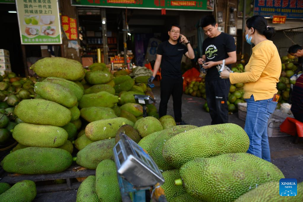 Customers select jackfruits at a local market in Haikou, south China's Hainan Province, March 8, 2022. (Xinhua/Hu Zhixuan)