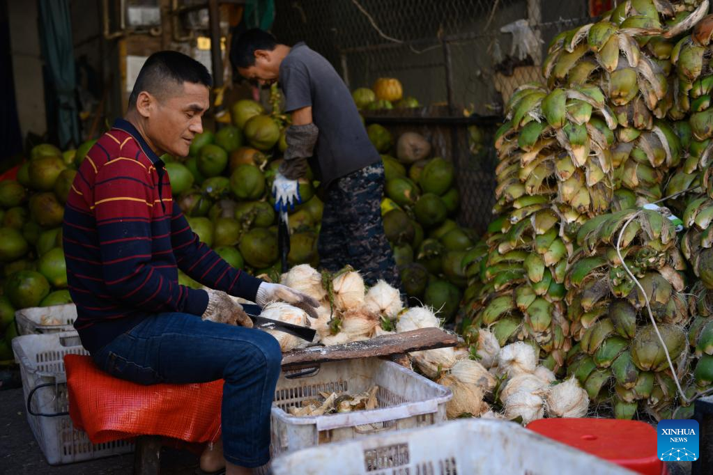 A vendor processes coconuts at a local market in Haikou, south China's Hainan Province, March 8, 2022. (Xinhua/Hu Zhixuan)
