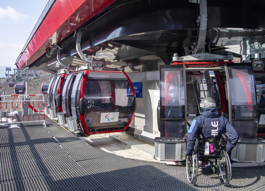 An athlete prepares to ride a cable car at China's National Alpine Skiing Center in Yanqing District, Beijing, capital of China, Feb. 28, 2022. (Xinhua/Sun Fei)
