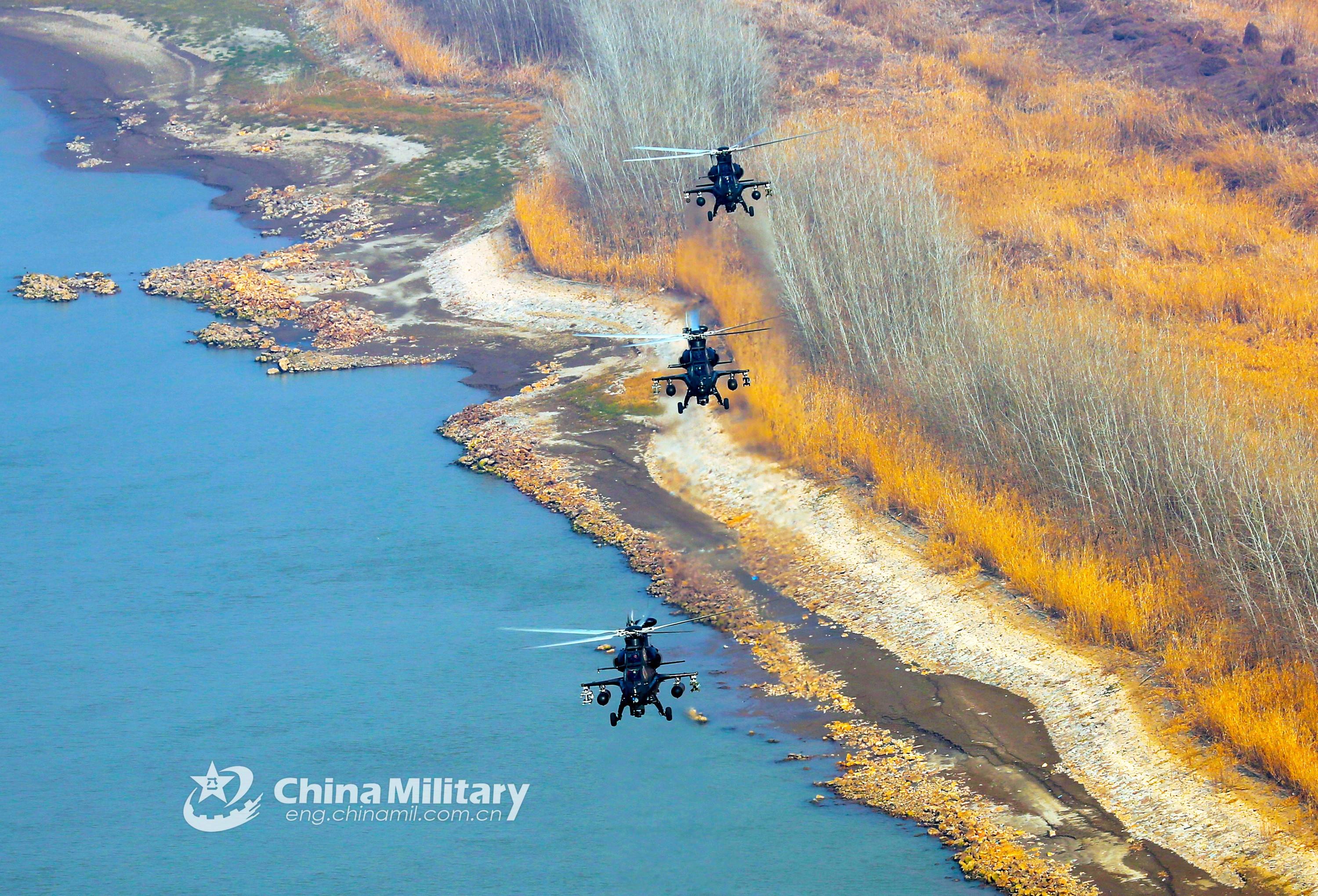 Attack helicopters attached to an army aviation brigade under the PLA 72nd Group Army fly over the river bank during a training exercise on February 17, 2022. (eng.chinamil.com.cn/Photo by Zhang Huanpeng)