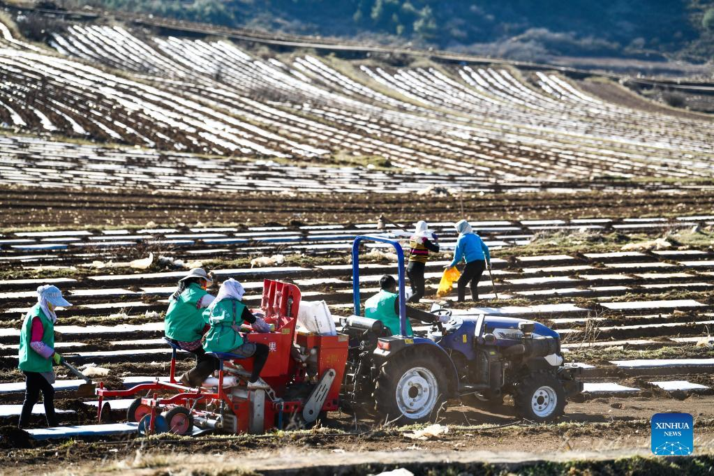 Farmers work in the fields in Weining, southwest China's Guizhou Province, March 8, 2022. In the process of consolidating poverty alleviation achievements and promoting rural revitalization, Guizhou has actively guided farmers to change farming methods and develop suitable agriculture industry in mountainous areas. At the same time, Guizhou made efforts to integrate agriculture with tourism and cultural industries, which helped to increase agricultural efficiency and farmers' income. (Xinhua/Yang Wenbin)