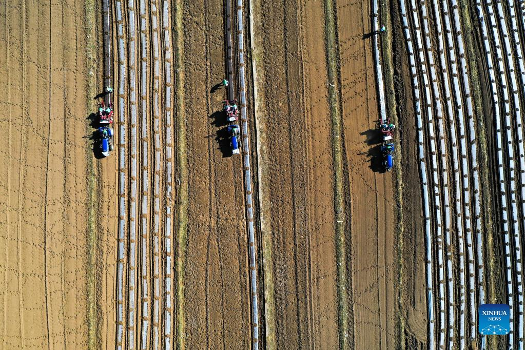 Aerial photo taken on March 8, 2022 shows farmers working in the fields in Weining, southwest China's Guizhou Province. In the process of consolidating poverty alleviation achievements and promoting rural revitalization, Guizhou has actively guided farmers to change farming methods and develop suitable agriculture industry in mountainous areas. At the same time, Guizhou made efforts to integrate agriculture with tourism and cultural industries, which helped to increase agricultural efficiency and farmers' income. (Xinhua/Yang Wenbin)