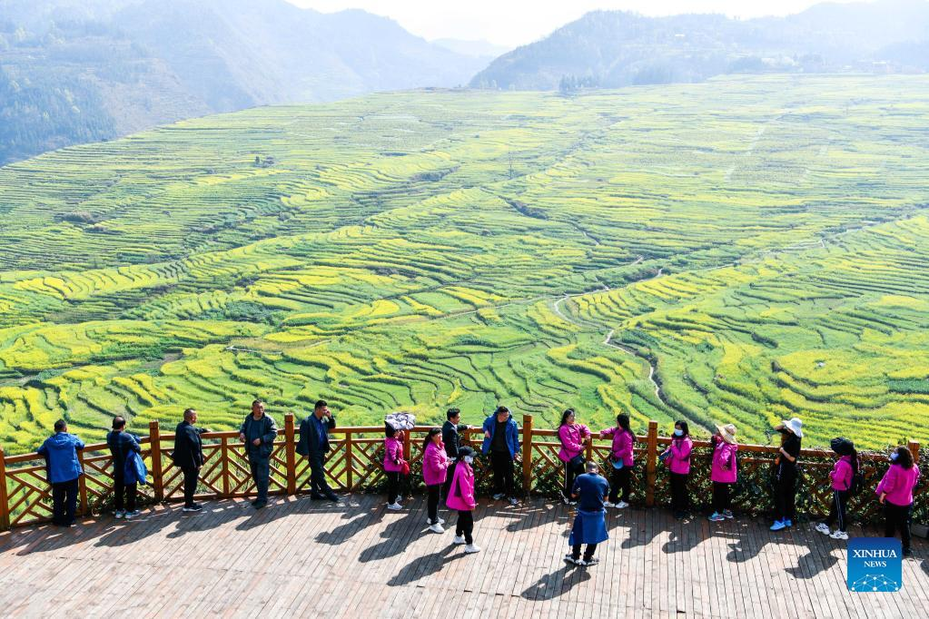 Tourists view the scenery of cole flower fields in Panzhou, southwest China's Guizhou Province, March 7, 2022. In the process of consolidating poverty alleviation achievements and promoting rural revitalization, Guizhou has actively guided farmers to change farming methods and develop suitable agriculture industry in mountainous areas. At the same time, Guizhou made efforts to integrate agriculture with tourism and cultural industries, which helped to increase agricultural efficiency and farmers' income. (Xinhua/Yang Wenbin)
