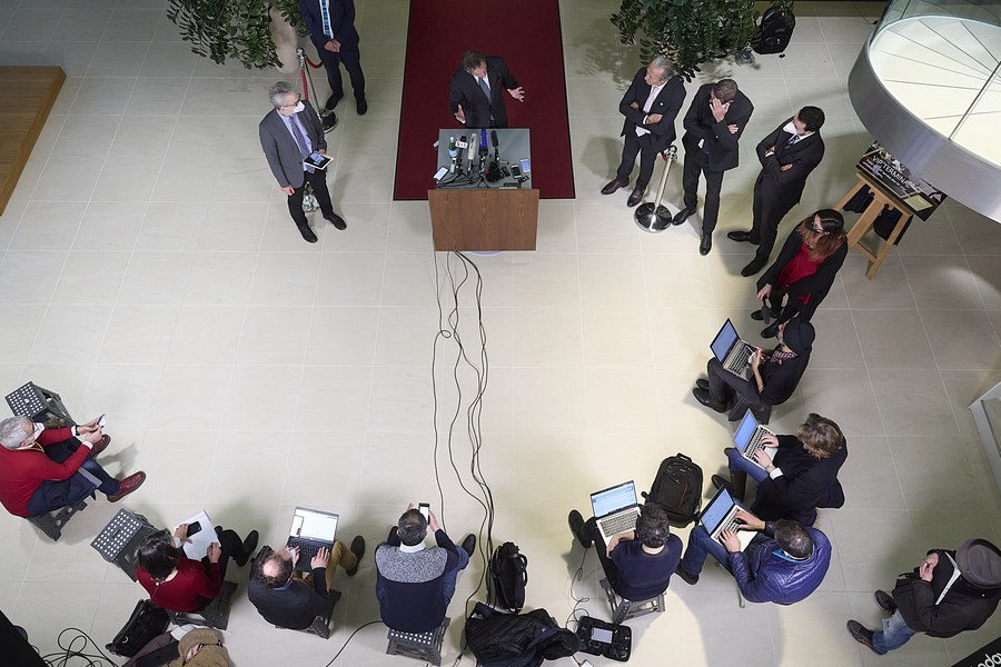 Photo taken on Dec. 17, 2021 shows a meeting of the Joint Comprehensive Plan of Action (JCPOA) Joint Commission in Vienna, Austria. (EU Delegation in Vienna/Handout via Xinhua)