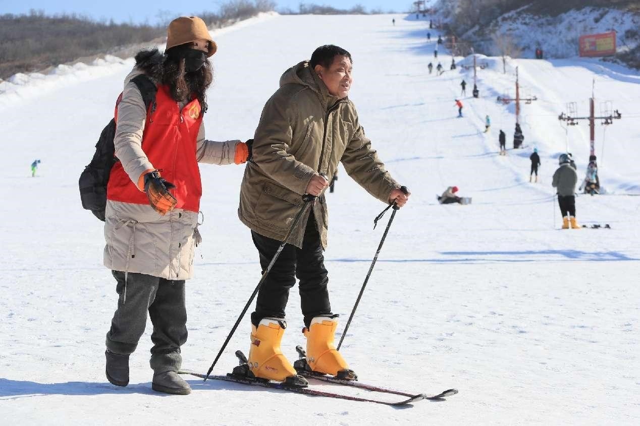 A man with disability skis under the assistance of a volunteer in Chaoyang, northeast China's Liaoning province, Jan. 20, 2022. (People's Daily Online/Qiu Yijun)