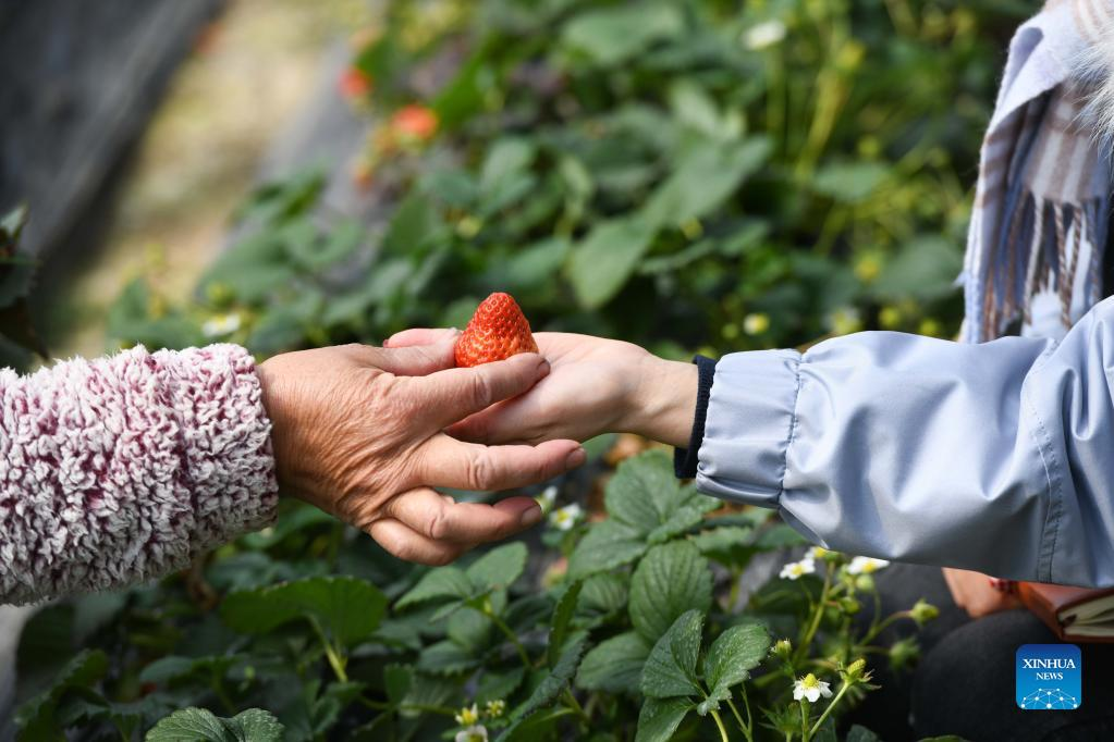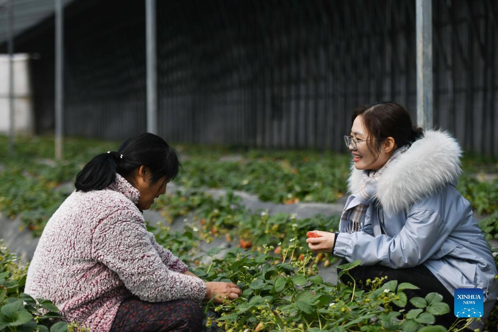 A farmer passes a strawberry she planted to Wang Mengmeng (R) in Wuwei Township of Dingyuan County, east China's Anhui Province, Feb. 22, 2022. Wang Mengmeng, a village official in east China's Anhui Province since 2013 when she began serving in her post after graduating from university, led the village in developing specialty agriculture to cash in on the region's transport and location advantages. After taking on her duties as a deputy to the National People's Congress in 2018, Wang has carried out multiple surveys on the methods of rural vitalization. The suggestions Wang put forward at China's ongoing "two sessions" focus on the long-term development pattern of rural collective economy. (Xinhua/Zhang Duan)