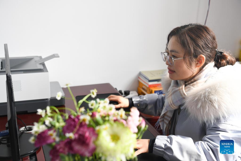 Wang Mengmeng works in her office in Dingyuan County, east China's Anhui Province, Feb. 22, 2022. Wang Mengmeng, a village official in east China's Anhui Province since 2013 when she began serving in her post after graduating from university, led the village in developing specialty agriculture to cash in on the region's transport and location advantages. After taking on her duties as a deputy to the National People's Congress in 2018, Wang has carried out multiple surveys on the methods of rural vitalization. The suggestions Wang put forward at China's ongoing "two sessions" focus on the long-term development pattern of rural collective economy. (Xinhua/Zhang Duan)