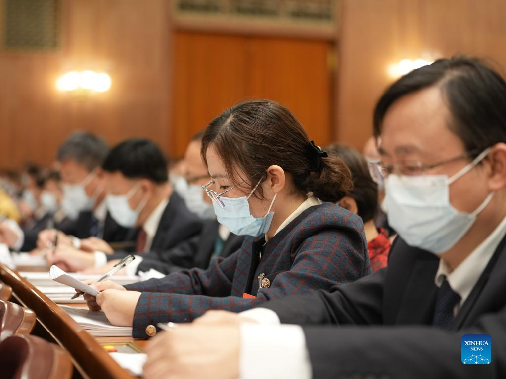 Wang Mengmeng attends the opening meeting of the fifth session of the 13th National People's Congress (NPC) at the Great Hall of the People in Beijing, capital of China, March 5, 2022. Wang Mengmeng, a village official in east China's Anhui Province since 2013 when she began serving in her post after graduating from university, led the village in developing specialty agriculture to cash in on the region's transport and location advantages. After taking on her duties as a deputy to the National People's Congress in 2018, Wang has carried out multiple surveys on the methods of rural vitalization. The suggestions Wang put forward at China's ongoing "two sessions" focus on the long-term development pattern of rural collective economy. (Xinhua/Xing Guangli)