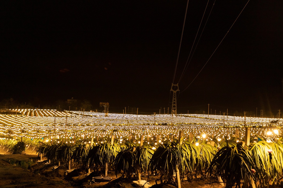LED lights are used on a dragon fruit farm in Ledong Li autonomous county in southern Hainan. It enhances yields of the fruit by one-third and increases the income of the local farmers. The lights are like a show every night during the winter season. [Photo by Lu Fanfeng/For chinadaily.com.cn]