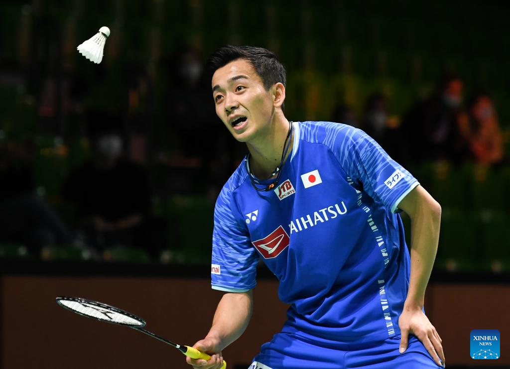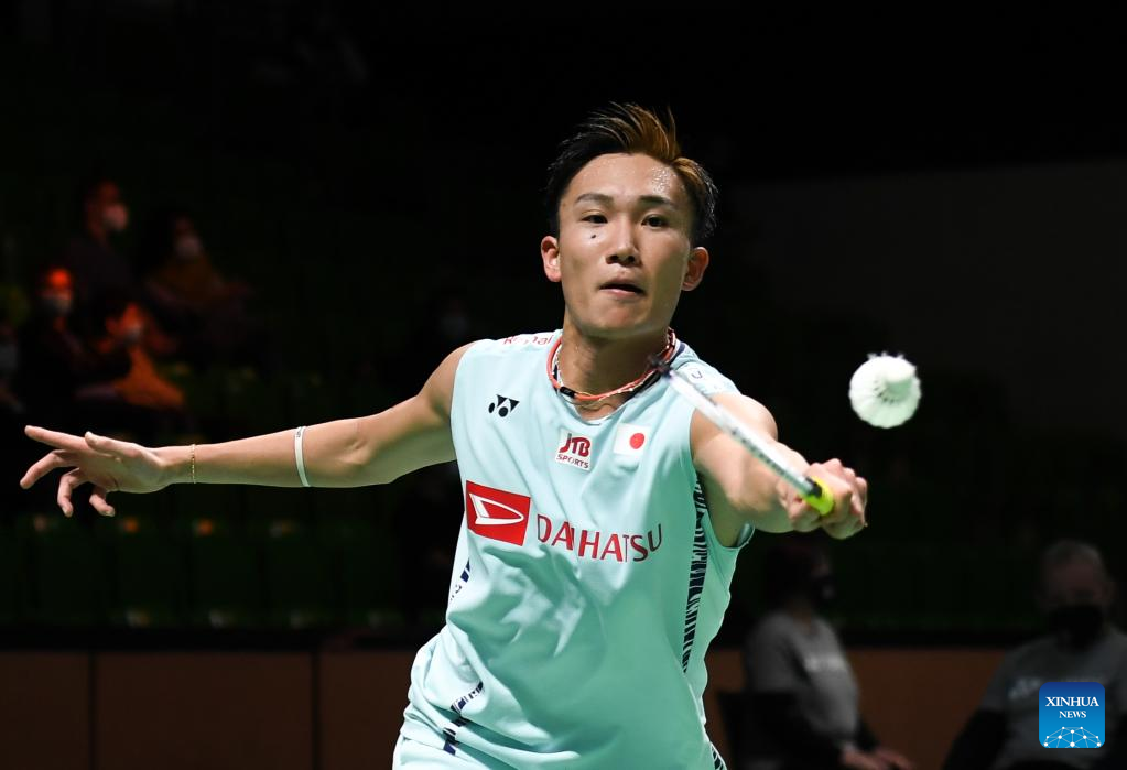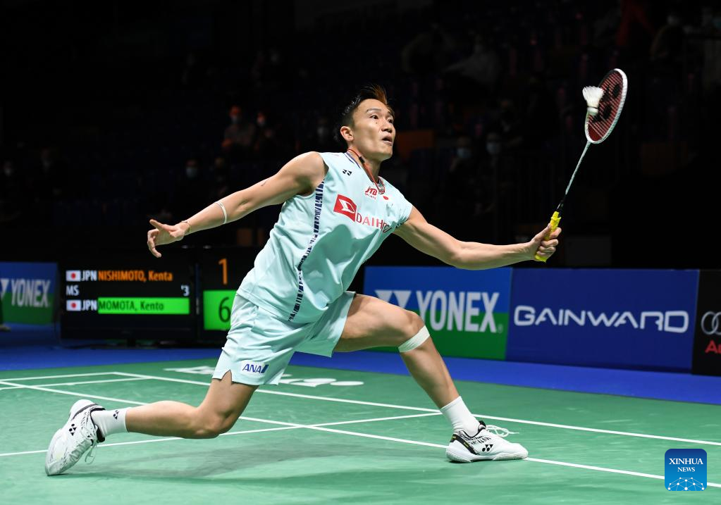 Momota Kento of Japan hits a return during the men's singles first round match against his compatriot Nishimoto Kenta at the Yonex German Open 2022 badminton tournament in Muelheim, Germany, March 9, 2022. (Xinhua/Lu Yang)