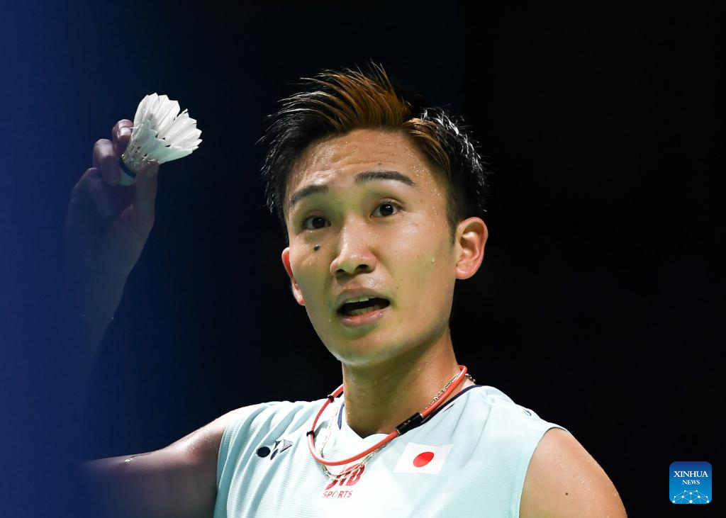 Momota Kento of Japan reacts during the men's singles first round match against his compatriot Nishimoto Kenta at the Yonex German Open 2022 badminton tournament in Muelheim, Germany, March 9, 2022. (Xinhua/Lu Yang)