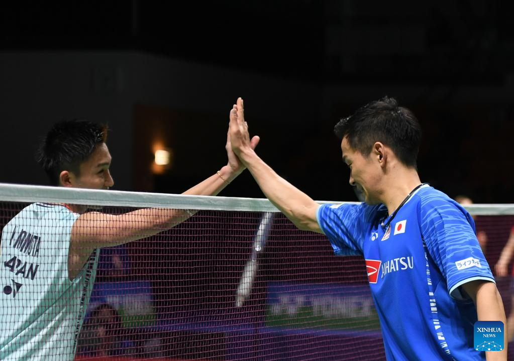 Momota Kento of Japan gestures to spectators after the men's singles first round match against his compatriot Nishimoto Kenta at the Yonex German Open 2022 badminton tournament in Muelheim, Germany, March 9, 2022. (Xinhua/Lu Yang)