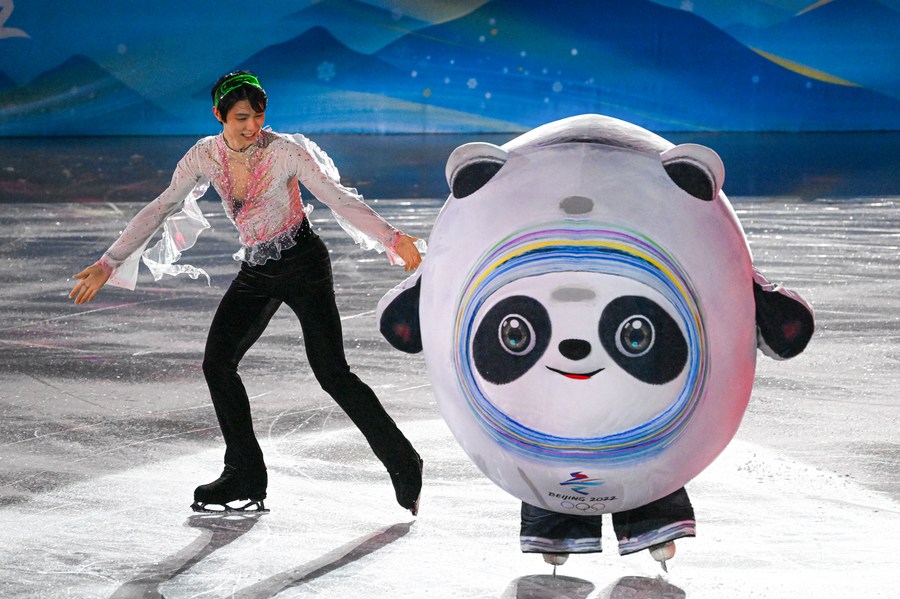 Hanyu Yuzuru of Japan and Bing Dwen Dwen perform during the figure skating gala event of the Beijing 2022 Winter Olympics at Capital Indoor Stadium in Beijing, capital of China, Feb. 20, 2022. (Xinhua/Wang Fei)