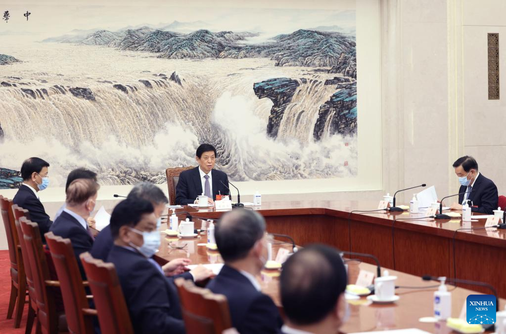 Li Zhanshu, an executive chairman of the presidium of the fifth session of the 13th National People's Congress (NPC) and chairman of the NPC Standing Committee, presides over the third meeting of executive chairpersons of the presidium at the Great Hall of the People in Beijing, capital of China, March 10, 2022. (Xinhua/Wang Ye)