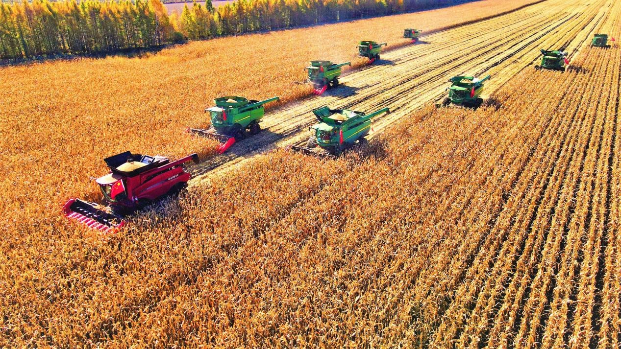 Corns are harvested by machines of the Bei'an Branch of Beidahuang Group Co., Ltd. in Bei'an, northeast China's Heilongjiang province, Oct. 6, 2021. (People's Daily Online/Xu Yingxian)