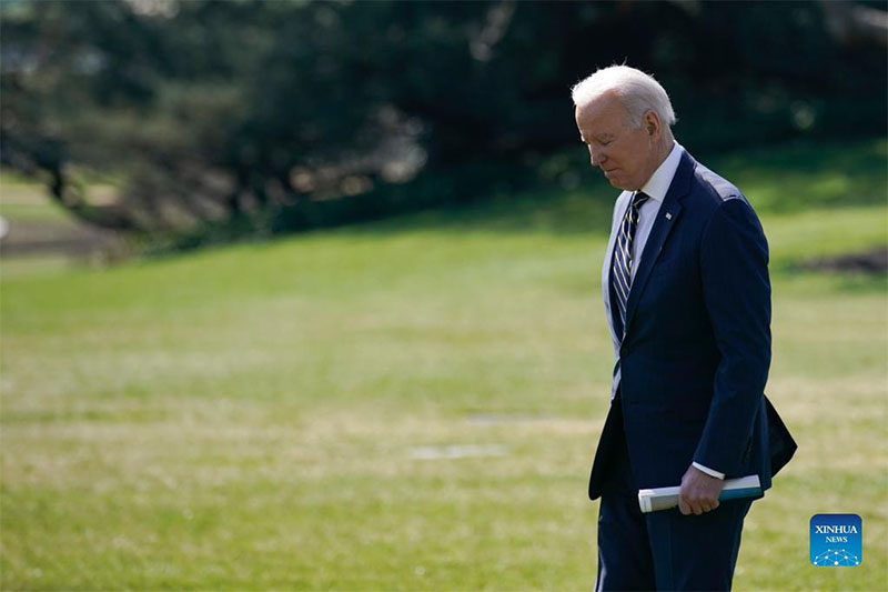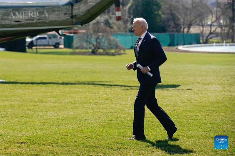 U.S. President Joe Biden walks on the South Lawn to board Marine One at the White House in Washington, D.C. March 11, 2022. The U.S. government will revoke Russia's most-favored nation trade status amid the Ukraine crisis, the White House said Friday, noting that it will work with Group of Seven (G7) countries and the European Union to roll out new sanctions. (Photo by Ting Shen/Xinhua)