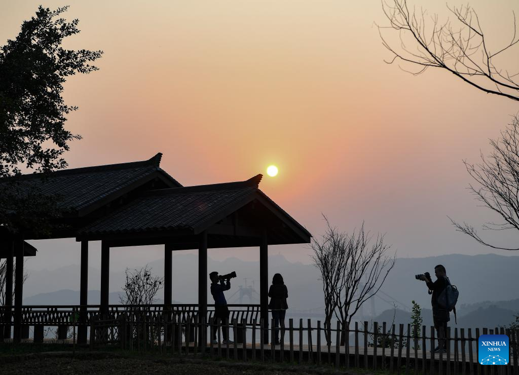 Aerial photo taken on March 10, 2022 shows the sunset seen from Guangyang Isle in southwest China's Chongqing. Guangyang Isle, the largest island on the upper Yangtze River, is rich in natural resources. In recent years, a series of measures have been taken to restore the natural ecological environment of the island. Now, the island attracts a large number of tourists every spring. (Xinhua/Wang Quanchao)