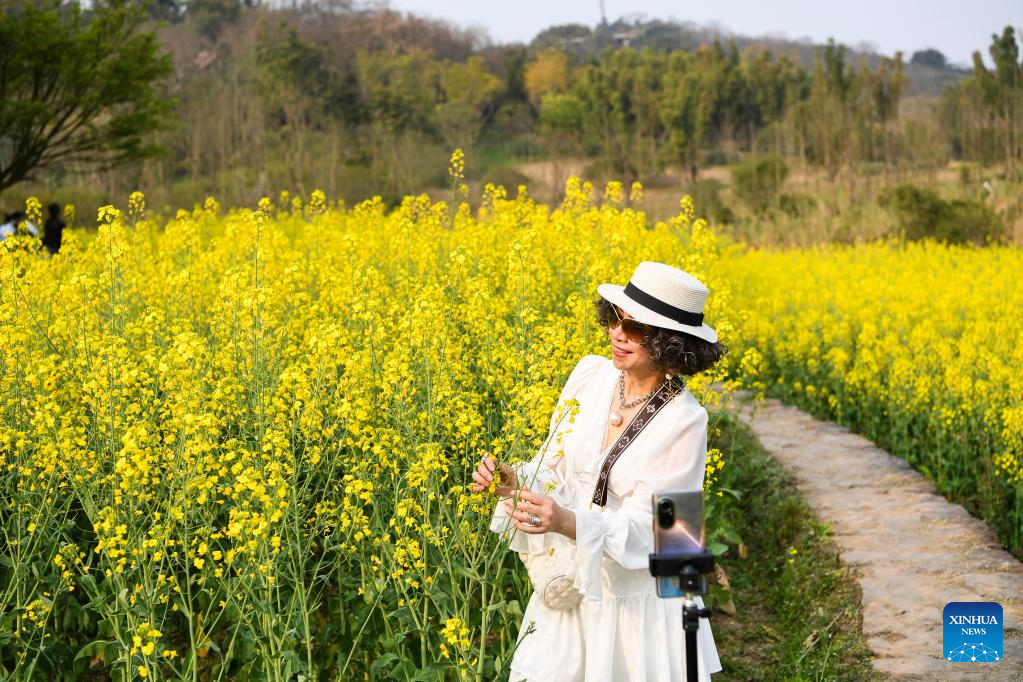 A tourist takes a selfie on Guangyang Isle in southwest China's Chongqing on March 10, 2022. Guangyang Isle, the largest island on the upper Yangtze River, is rich in natural resources. In recent years, a series of measures have been taken to restore the natural ecological environment of the island. Now, the island attracts a large number of tourists every spring. (Xinhua/Wang Quanchao)
