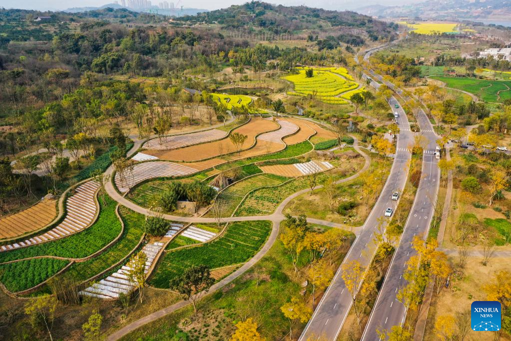 Aerial photo taken on March 10, 2022 shows the scenery of Guangyang Isle in southwest China's Chongqing. Guangyang Isle, the largest island on the upper Yangtze River, is rich in natural resources. In recent years, a series of measures have been taken to restore the natural ecological environment of the island. Now, the island attracts a large number of tourists every spring. (Xinhua/Wang Quanchao)