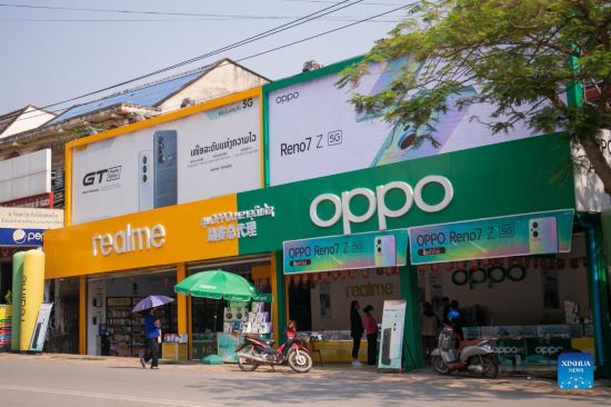 Photo taken on March 11, 2022 shows a mobile phone store selling Chinese brands products in Muangxay, northern Laos. Since its opening in December 2021, the China-Laos Railway has been injecting impetus into the development of the business hub in northern Laos, Muangxay, by facilitating logistics and the passengers' travelling, and promoting the trade between China and Laos. (Photo by Kaikeo Saiyasane/Xinhua)