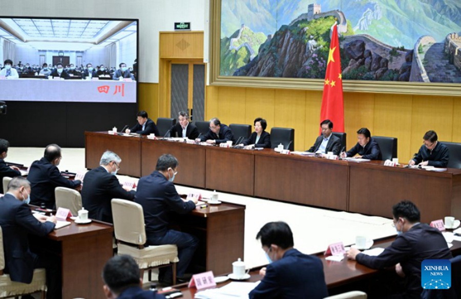 Chinese Vice Premier Sun Chunlan, also a member of the Political Bureau of the Communist Party of China Central Committee, speaks at a national teleconference of the State Council joint prevention and control mechanism against COVID-19 on March 12, 2022. (Xinhua/Zhang Ling)
