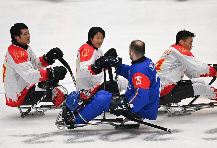 Yu Jing (2nd L) of China greets Francesco Torella (2nd R) of Italy after the para ice hockey preliminary round Group B match of the Beijing 2022 Paralympic Winter Games at National Indoor Stadium in Beijing on March 8, 2022. (Xinhua/Zhang Bowen)