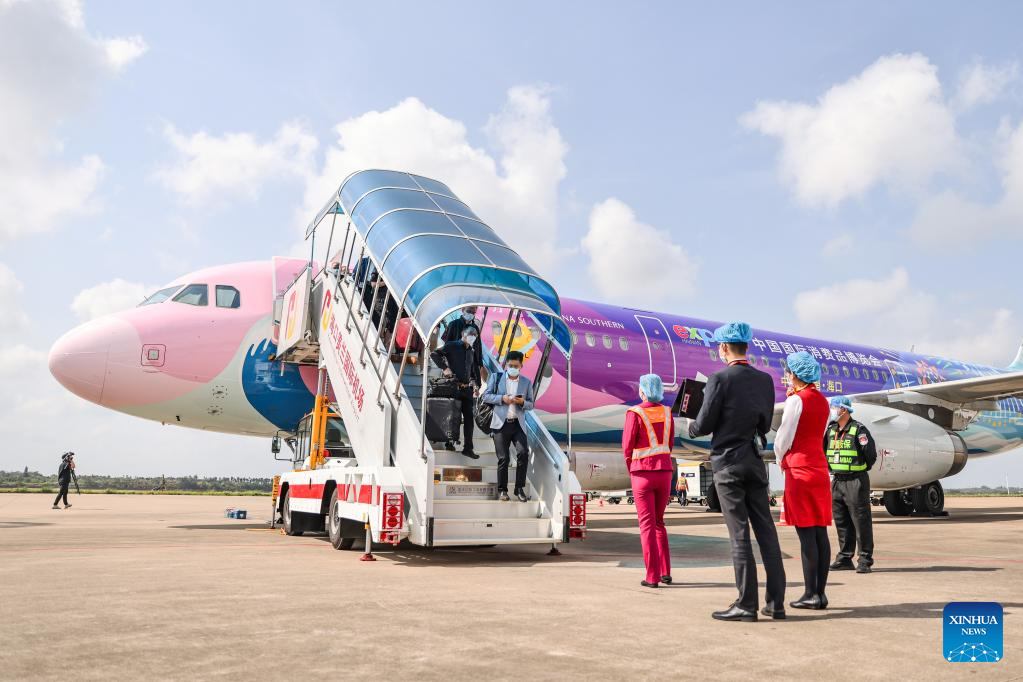 Passengers get off a plane painted with patterns of the China International Consumer Products Expo at Meilan International Airport in Haikou, south China's Hainan Province, March 13, 2022. China Southern Airlines' aircraft themed with International Consumer Products Expo arrived in Haikou on Sunday, completing its maiden flight. (Xinhua/Zhang Liyun)