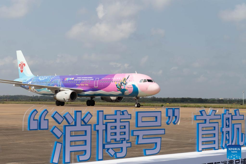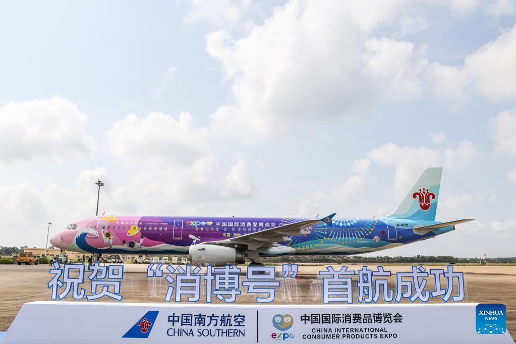 A plane painted with patterns of the China International Consumer Products Expo arrives at Meilan International Airport in Haikou, south China's Hainan Province, March 13, 2022. China Southern Airlines' aircraft themed with International Consumer Products Expo arrived in Haikou on Sunday, completing its maiden flight. (Xinhua/Zhang Liyun)