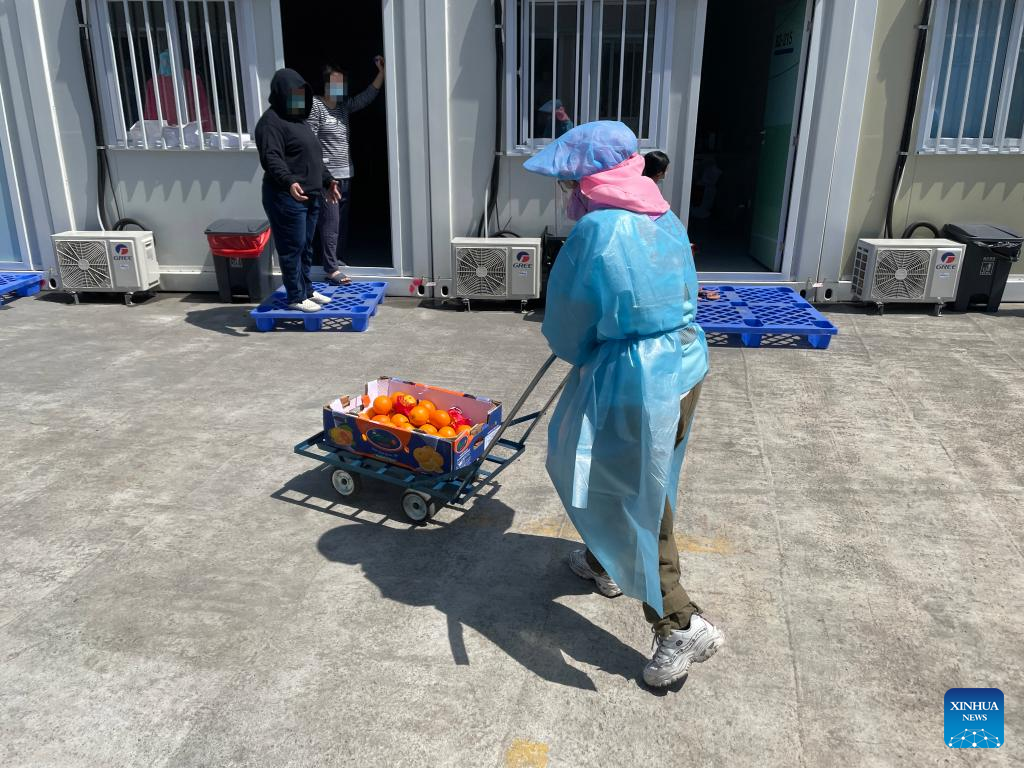 Photo taken with a mobile phone shows a medical staff member distributing fruits at a community isolation facility in south China's Hong Kong, March 12, 2022. (Xinhua)