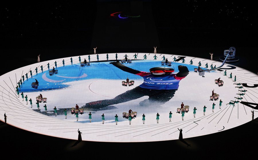 Photo taken on March 13, 2022 shows a scene of the performance during the closing ceremony of the Beijing 2022 Paralympic Winter Games at the National Stadium in Beijing, capital of China. (Xinhua/Zhang Keren)